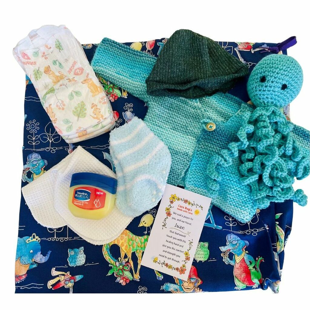 Infant Comfort Care Bag's: Drawstring bag/Ziploc, facecloth, soap/Vaseline, nappies, knitted clothing, blanket, teddy bear/toy, comforting message
